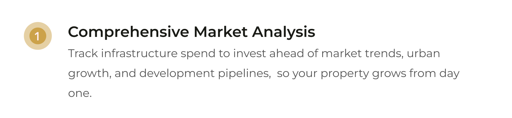 Track infrastructure spend to invest ahead of market trends, urban growth, and development pipelines, so your property grows from day one.