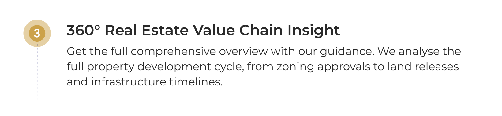 Get the full comprehensive overview with our guidance. We analyse the full property development cycle, from zoning approvals to land releases and infrastructure timelines.