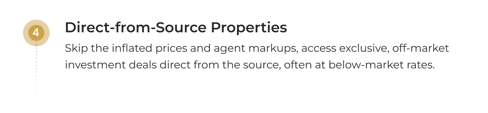 Skip the inflated prices and agent markups, access exclusive, off-market investment deals direct from the source, often at below-market rates.